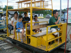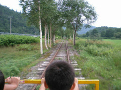 8/14稚内公園出発。 日本最北端の地「宗谷岬」に行きました。 (写真はお友達の一家です。我が家は写真を撮ってませんでした!) それから、朝食に宗谷岬の裏の高台にある間宮食堂で「ほたてラーメン」を食べました。塩味にほんのりほたてのだしがきいておいしいラーメンでした。(朝食にしては重かった。) 宗谷岬を出て次に浜頓別に砂金取りに行きました。ここでは天然の川でいまでも砂金が取れるようです。何とか旅行代を捻出!と鼻息荒く踏み込んで行ったのですが・・ひとり¥500払って、取り方のビデオを見て、道具を借りて、川に入りました。(きれいな川で川に入っているだけでも心地よいです。)川ではインストラクターのお兄さんがいて、はじめてと察して、まず見本を見せてくれました。木の板に砂利と砂をのせて、川の中で揺らしながら金だけをより分けていきます。米粒よりも小さい金が3粒取れました。さて、我々もやってみます、思ったより重労働です。20分くらいかかってやっと石と砂をより分けて、中からひときわ輝く金の粒が出てきた時は感動ものでした。「あったー!」と思わず大声をあげてしまいました。しかし、1サイクルやっただけで足腰が痛みだし、 1時間半(3回くらい)くらい経ったころは、全員がギブアップ!1時間半で全員で砂の粒のような金が10個くらいでした!(旅行代どころか入場料にも届かないか・・)とれた砂金はさらに\500払って専用のビンに入れ、息子の鉱物コレクション入りしました。 目標には遠く及びませんでしたが、それなりに楽しかったです。 浜頓別を出発して音威子府の道の駅で名物の黒いおそばをいただき、美深のトロッコ王国に行きました。 ここでは、廃線の線路をトロッコで探検できます。 午後4時くらいに到着。ぎりぎり最後のグループに入れさせていただきました。単線なので20台のトロッコがいっせいに出発して、またいっせいに戻ってきます。前のグループが行ったばかりなので、帰ってくるまで小1時間待ちました。写真のようなエンジンつきの小さなトロッコを自分で運転して、廃線を往復10kmを走ります。途中、鉄橋などもあり、かなりワイルドです。遊園地気分で子供達も大喜びです。ここでしか味わえない貴重な体験でした。 途中、士別で飛び入りで花火大会を見学して、旭川郊外の道の駅「とうま」でP泊。 道の駅「とうま」は街道沿いで通りも多く、道の駅も混雑していました。 |