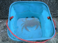 今年もチアユの時期になったので、 日立港に釣りに行ってきました・・が、 今年はぜんぜんチアユが来ていないとのこと。 止むを得ず河口で投げ釣りをしました。 あたりもなく子供も飽きだしたころ、 リールを巻いてみると何か重い。 だけど魚のように動いている様子はない。 きっとゴミだな・・と上げてみると カニがかかっていました。 ヒラヅメガニというカニのようです。 まあまあの大きさなのでキープ! 喜んでしばらくはやる気がでたのですが、 またまた無反応の時間が流れ、 またまた子供が飽きだした頃、 おとなりで型の良いヒラメが上がりました。 またまたがぜんやる気を起こしがんばったところ、 しばらくして、またまた同じような大きわのヒラヅメガニがかかりました。 結局カニ2匹だけでしたが、 真っ赤に日焼けして、顔が痛くなってきたので 終了して上がることに、お隣りのおじさんに ヒラメを見せてもらいにいったところ、 哀れに思ったのか。ワタリガニを一匹くれました。 日立まで行ってカニ3匹は採算は合いませんが、 とってきたカニの味噌汁は格別でした。 ゆでたカニと勝るとも劣らない赤ら顔の父と息子でした。 |