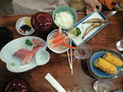2日目の朝。最初に東尋坊へ向かいました。(混雑前に行動ができるのがキャンピングカーのメリットですね。) 岩場の先端まで恐る恐る行ってみました。が、子供がちょろちょろするのが心配になって早々にUターン。景色もろくに見ずに引き返しました。 従って、途中のお土産屋さんめぐりがメインに。 息子の大好きな鉱物を売っているお店がたくさんありました。 朝食がまだだったので、途中のお土産屋さんで学生定食という朝食を食べました。 おいしそうな海鮮丼やうに丼はたくさんあったのですが、朝食としては予算オーバーでした。 学生定食が唯一予算ギリギリでした。 きっと学生向きのボランティア定食なのでしょう。お刺身あり、カニありの盛りだくさんで、お値段割りに納得の食事ができました。 東尋坊を出発して、加賀温泉にある加賀文化村へ、民間の大きなテーマパーク風のお土産屋さんです。 こちらに折り紙博物館が併設されているので入ってみました。折り紙の好きな子供達は大喜び。 お花や大名行列などいろいろな折り紙が飾ってあります。 中でも一番気に入ったのが、恐竜の折り紙。どれも一見して恐竜の名前がわかるくらい上手に折ってあります。 出口の売店ではこの「恐竜の折り紙」の折り方の本が置いてありました。 子供達にせがまれて、こちらは大人が買って子供達に貸し出すことにしました。 折り紙博物館の下では、いろいろなおいしそうなお菓子のお土産があります。ひととおり試食した上でお土産を買い集めました。 文化村を出発して、加賀温泉郷のひとつ片山津温泉に。 加賀温泉郷にはそれぞれ「総湯」という日帰り温泉施設があり、\400程度で入浴できます。 片山津温泉では足湯施設のところで生たまごと温泉饅頭を売っていました。 生たまごは30分温泉につけて温泉たまごにして食べる趣向です。 片山津温泉はしょっぱい温泉(塩泉)で温泉たまごにすると程よい塩加減でおいしいです。 それから、柴山潟で屋形船のような遊覧船で湖上観光しました。暑くなっていたので夕涼にちょうどよかったです。 夜は山中温泉へ行きこちらの「菊の湯」という総湯に入りました。 きれいで立派な銭湯で、お湯もきれいで豊富でとても良い温泉でした。 |