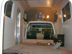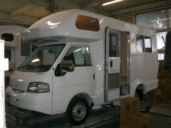 キャンピングカーの工場がすぐ近くだったので、 製作中の見学にちょくちょくおじゃましました。 写真はペインティング直後のアレンちゃんです。 中はまだこんな感じです。 |