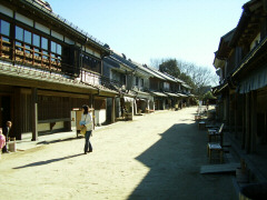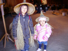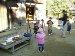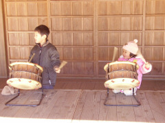 とても寒いので、暖かいところへと、 千葉の旭市へいちご狩りに行こうと考えていました。 が、当日なんと寝坊!時間が足りなそうになったので、 途中で目的地を変更して「房総のむら」へ行くことに。 越谷から利根川沿いを通って1時間半くらいです。 ここは、様々な伝統芸能を体験して学べるのが特長の公園です。 当日も竹馬作りや千代ローソク、蕎麦がき、花餅作り、機織り体験や、だるま作りなど、いろいろな体験コースが催されていました。 小学生以下無料なので大人1名¥300×2=¥600払って入場。 入るとすぐに昔の商店街を模した街並みが現れます。 飯屋、薬屋、魚屋、鍛冶や、大工・・ 見て歩くだけでも結構楽しいです。 お茶屋さんでは、お茶菓子も食べられます。 街並みを戻って、農家の方へ行くと、おまつり広場の家屋では、 太鼓たたきの体験をやってました。 地元のお兄ちゃんがじょうずにたたいていましたので、 お兄ちゃんに教わりながらたたきました。 聞くところによると学校の授業の中で教わっているとのこと、 たいこは上手にたたけると格好いいですね。 うちの子ども達もたいへん気に入って、 次の人が来ないのをいいことにずいぶん長いこと遊ばさせていただきました。 奥の農家では芋餅の餅つきの体験もやっていたようです。 太鼓たたきがなが過ぎて、体験プログラムに間に合わなかったのですが、 おいしそう!と騒ぎながら覗き込んでいたら、 「内緒で分けてあげる。」と少しお餅をいただいてしまいました。ラッキー!! また、農家のお庭には竹馬やパカパカやコマなど昔の遊び道具があって、自由に遊べるようになっていました。 あれこれ珍しいもの、懐かしいものを触って遊んでいるうちにあっという間に時間が過ぎました。 公園は風土記の丘エリアも含めるとたいへん広く、 1日ではまわりきれないほどです。 帰りに併設されている町の駅「ドラムの里」にある レストランに寄りました。 ここの「クリームあんみつ」と「おはぎ」が安くて、 とてもおいしかったです。(おすすめ!) 成田の飛行場が近いので、夕方に飛行場横の公園で飛行機を見て帰りました。 |