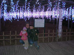 クリスマスに群馬県の足利フラワーパークに行ってきました。 藤の花で有名な足利フラワーパークですが、 クリスマスには園全体が電飾で飾られて、とてもきれいです。 インターネットで割引券を印刷して、越谷を昼過ぎに出発。 佐野のショッピングセンターでちょっと遊んで、 そしてケーキを買って、足利フラワーパークに5時ころ着きました。 さすがにクリスマスイブとあって、たくさんの人が来ていましたが、 大混雑というほどではありませんでした。 入口でプレゼント引き換え券をもらったので、引き換え場所に行ってみると、 サンタさんがいて、風船をプレゼントしてくれました。 サンタさんから直接もらったのははじめてだったので、子ども達はおおはしゃぎでした。 園内には巨大なツリーの他、お花や、お月様や、ベンチに馬車など、 いろんな電飾があり、それぞれで記念撮影ができるようにもなっていて、 とても楽しかったです。 また、藤の花を模した電飾はとてもきれいでした。 子ども達も大満足したところで、 キャンピングカーに戻り、ケーキを食べたり、ゲームをしたり、 プチクリスマスパーティーをしました。 そして、子ども達が眠くなったころ、家路につきました。 |