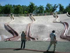 8/18道の駅「名水の郷きょうごく」で朝を迎えます。 今日もどんより雲っていて、期待した羊蹄山の景色が見れず残念でした。朝みなで名水「羊蹄のふきだし湧水」を飲みに行きました。こちらは日本の名水百選にも選定された名水がたくさん湧き出してしるところです。湧水というと「こんこんと湧く」というイメージですが、こちらはドバドバとものすごい量が湧出しています。みなさん18リットル缶に入れて持っていっていますが、がんがん汲んでも足りなくなる心配ないようです。私たちもペットボトルに入れて帰りました。こんな良いお水の近くに生活できるのはうらやましいですね。 名水の郷きょうごくを出発して、私のリクエストで来年サミットが開かれる予定のザ・ウィンザーホテル洞爺リゾートの見学に行ってきました。サミット会場に選定される前から、山の上に立ち異様な存在感を放つこの建物が、(北海道に来るたびに)気になっていたのです。そこで今回ぜひということで見学に行ったのですが、結果的には「当局の指導により、見学お断り」で中には入れませんでした。またキリがでていて視界も悪く、景色も見えず残念な結果になりました。 ウィンザーホテルはあきらめ、洞爺湖温泉近くの西山火口散策路に行きました。ここは2000年に噴火によって被災した建物や道路などをそのまま保存してある生々しい散策路です。散策路の脇からはいまでも噴気が出ていて、地面に手を当てると熱くなっています。(年々熱くなっているとのこと。こわっ!)破壊されたお菓子工場などが強烈でした。噴火のときはひどい被災でしたが、それも観光化してしまう洞爺湖温泉の方々のたくましさを感じました。帰りに売店でとうきびを食べました。生食でもおいしいとのことで、食べてみましたがほんとに甘くておいしいとうきびでした。 ここからは函館へ向けての帰り道。楽しい旅も終わりの感じがして、この街道の帰り道はいつもたそがれ感いっぱいです。 お子様向けのメインイベント、噴火湾パノラマパークに寄って、公園で遊びました。 こちらの公園は、前回連れてった子供達が北海道どこが一番良かった?と尋ねたらまっさきにあげた場所で、子供達大人気の公園です。他にもっと広い公園もあると思うのですが、こちらの公園は子供達にとって他にはない魅力を放っているようです。たっぷり遊ばせたつもりですが、まだまだ遊び足りない様子。先の行程が心配なのでいやがる子供また大人のなんとか尻をたたいて出発しました。 後はまっすぐ帰り道です。 函館ラーメンを食べて夜行のフェリーにのり青森へ。 そのまま夜行で高速にのり翌19日15時ころ越谷に到着しました。 |