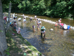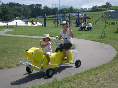 8/14稚内公園出発。 日本最北端の地「宗谷岬」に行きました。 (写真はお友達の一家です。我が家は写真を撮ってませんでした!) それから、朝食に宗谷岬の裏の高台にある間宮食堂で「ほたてラーメン」を食べました。塩味にほんのりほたてのだしがきいておいしいラーメンでした。(朝食にしては重かった。) 宗谷岬を出て次に浜頓別に砂金取りに行きました。ここでは天然の川でいまでも砂金が取れるようです。何とか旅行代を捻出!と鼻息荒く踏み込んで行ったのですが・・ひとり¥500払って、取り方のビデオを見て、道具を借りて、川に入りました。(きれいな川で川に入っているだけでも心地よいです。)川ではインストラクターのお兄さんがいて、はじめてと察して、まず見本を見せてくれました。木の板に砂利と砂をのせて、川の中で揺らしながら金だけをより分けていきます。米粒よりも小さい金が3粒取れました。さて、我々もやってみます、思ったより重労働です。20分くらいかかってやっと石と砂をより分けて、中からひときわ輝く金の粒が出てきた時は感動ものでした。「あったー!」と思わず大声をあげてしまいました。しかし、1サイクルやっただけで足腰が痛みだし、 1時間半(3回くらい)くらい経ったころは、全員がギブアップ!1時間半で全員で砂の粒のような金が10個くらいでした!(旅行代どころか入場料にも届かないか・・)とれた砂金はさらに\500払って専用のビンに入れ、息子の鉱物コレクション入りしました。 目標には遠く及びませんでしたが、それなりに楽しかったです。 浜頓別を出発して音威子府の道の駅で名物の黒いおそばをいただき、美深のトロッコ王国に行きました。 ここでは、廃線の線路をトロッコで探検できます。 午後4時くらいに到着。ぎりぎり最後のグループに入れさせていただきました。単線なので20台のトロッコがいっせいに出発して、またいっせいに戻ってきます。前のグループが行ったばかりなので、帰ってくるまで小1時間待ちました。写真のようなエンジンつきの小さなトロッコを自分で運転して、廃線を往復10kmを走ります。途中、鉄橋などもあり、かなりワイルドです。遊園地気分で子供達も大喜びです。ここでしか味わえない貴重な体験でした。 途中、士別で飛び入りで花火大会を見学して、旭川郊外の道の駅「とうま」でP泊。 道の駅「とうま」は街道沿いで通りも多く、道の駅も混雑していました。 |
