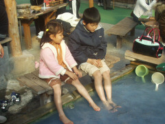 1/3 九州といえども寒かったです。 湯布院は結構雪が残っていました。 朝は九州に渡った時の定番「joyful」で朝食と取りました。 それから湯布院を散策。 湯布院はさすが観光地。寒さとか関係なくお正月でもほとんどのお店が開店しています。 また、お客さんもびっくりするほど多いです。 今日がまだ三が日だということを忘れてしまいそうです。 湯布院の街でのお買い物は楽しいですね。 漬物やお菓子など試食しながらお土産買い集めました。 子供達もお年玉替わりにじーじ、ばーばに高価なオルゴールを買ってもらってました。 午後は別府で地獄巡りをしました。 最初の地獄の近くで名物の「だんご汁」を食べました。 「だんご汁」は名前からして「つみれ汁」のようなものという先入観がありましたが、 みそ風味の煮込みうどんで、長崎ちゃんぽん風のほうとうといった感じでした。 具沢山でとてもおいしくいただきました。 おなかを満たしたところで、地獄巡り開始です。 温泉はさすがにお正月といえども無休で湧いています。 お正月イベントで、着ぐるみの鬼とじゃんけんして 勝つとタオルがもらえるイベントをやっていました。 さっそく並んでじゃんけん。 子供にはそっとグーチョキパーを教えてくれることもあり、みごとタオルを3枚ゲット! 今年はついているかも。 地獄巡りを楽しんだあと、別府の「ひょうたんの湯」という日帰り温泉に入ってきました。 2階の高さから落ちる打たせ湯が名物の温泉でした。 |