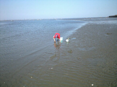 天気予報で絶好の行楽日和になるとのことで、 お出掛け候補のひとつ潮干狩りを調べたら、 ちょうど大潮にあたる日だったので、潮干狩りに決定! 土曜日の夜に出発。千葉の富津公園でP泊して、 富津へ潮干狩りに行きました。 天気予報では気温もあがり風も弱く暑いくらいになるとのことで、 我々は半ズボンにビーチサンダルだけ用意して軽装備で出動しました。 大潮ということもあって、たくさんの人たちがきていましたが、 私達のように半ズボンにビーチサンダルという人はほとんどいませんでした。 この時期は海はまだつめたいようで、皆さん長靴に長ズボン、ウインドブレーカーの重装備。 ちょっと認識が甘かったか。 されど、大潮でほとんど水が引いていたので、水につからまければ、足はサンダルでもOKでした。 しかしながら、風がふいてきたら、とたんに寒くなってきました。 ウインドブレーカーなどはあった方が良かったですね。 小1時間がんばるも子供達が寒いと言い出したので、 やむなく撤収することに。 小さな貝などは海に戻して、バケツ3cmくらいのあさりを持ち帰りました。 陸に上がるとポカポカ陽気。 後は近くの公園で遊びました。 |