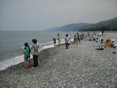5/3。今日はヒスイ海岸でヒスイ拾いをすることにしました。 まずは糸魚川のフォッサマグナミュージアムへ行きました。 そこで、ヒスイやその他の石の勉強することにしました。 博物館の受付で石拾いの前に勉強しに来たことを話すと、 「ヒスイの探し方」というプリントを特別に渡してくれました。 我々にはたいへん貴重なプリントでこれだけでも来た価値がありました。 館内にはヒスイの他、様々な鉱物の展示があり、鉱物好きの息子はもとより、 光物の好きな娘や、意思には関心のないはずの家内も真剣に見ていました。 立派できれいな博物館ですが、GWなのにすいていて良かったです。 ヒスイ探しの勉強をしたところで、ヒスイ海岸(宮崎、境海岸)に向いました。 海岸には無料の駐車場があり、そこに駐車して、 ビニルシートと折りたたみイスでベースキャンプをつくりました。 海岸には何グループか同じようにヒスイ探しをしている人たちがいました。 何人かに声をかけましたが、あまり取れてなさそう。 我々もプリントを手に探しはじめましたが、海岸の石はあまりにも多くて、 そこからヒスイを探すのはたいへんなことがわかりました。 相当根気と経験がいるものだとわかりました。 息子はいつもまにかダム作りに仕事が変質していました。 私達もいつの間にかビニールシートでお茶と昼ねがメインになってしまいました。 とてもきれいな海岸でお茶と昼ねだけでもとても心地よいところです。 しかもGW中にこんなにのびのびできるのはうれしい限りです。 しかし残念ながらヒスイは1個も見つかりませんでした。 (というよりあまり探しませんでした。) 誰かが1個でも探し当てたら、また違ったかもしれません。 ヒスイ探しを終えて、次に新湊の海王丸パークへ行きました。 海王丸パークはGW中のイベント(お祭り)をやっていました。 。海王丸の帆をはるイベントは残念ながら1日違いの明日で、見ることができませんでした。 それから道の駅新湊カモンパークで名物の「白エビかき揚げ丼」をたべました。 さくさくの衣と大きなしらすのような白エビがとてもおいしいどんぶりでした。 お値段もリーズナブルでよかったです。 それから海の近くにある「越の庭」という日帰り温泉に入りました。 そして、夜のうちに白川郷へ向かいました。 |
